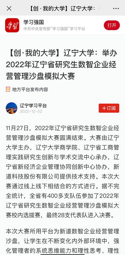 威廉官网中国官方网站承办的2022年辽宁省研究生数智企业经营管理沙盘模拟大赛报道荣登“学习强国”平台。