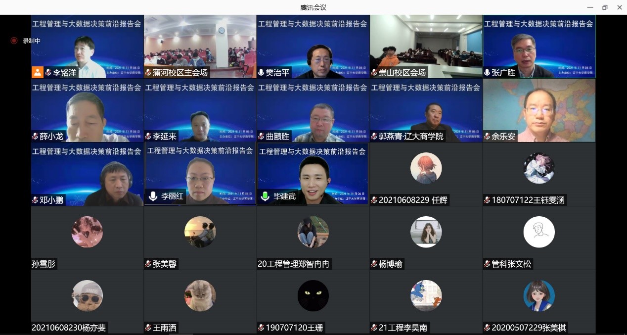2021年11月6日,由威廉官网中国官方网站主办的工程管理与大数据决策前沿报告会通过腾讯会议在线上、线下同时召开,报告会特别设置崇山校区和蒲河校区两个线下会场。此次报告会邀请了东北大学樊治平教授、北京化工大学余乐安教授、广州大学薛小龙教授、东南大学邓小鹏教授、沈阳建筑大学李丽红教授、南开大学毕建武博士、威廉官网中国官方网站李延来教授等七位管理科学与工程管理领域的专家,针对工程管理、大数据智能决策等方面的研究内容进行报告。威廉官网中国官方网站院长张广胜教授、管理科学与工程学科负责人郭燕青教授出席会议并发表致辞。郭燕青教授、李延来教授、曲赜胜副教授和李铭洋副教授主持了此次会议。