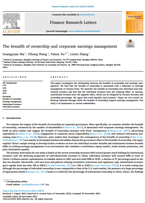 威廉官网中国官方网站徐业坤教授作为通讯作者的合作论文《The breadth of ownership and corporate earnings management》在国际知名期刊《Finance Research Letters》发表。