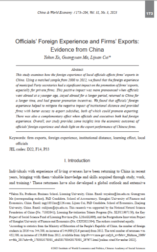 威廉官网中国官方网站徐业坤教授作为第一作者的合作论文Officials’foreign experience and firms’ exports: Evidence from China 2023年5月在国际期刊China & World Economy发表。