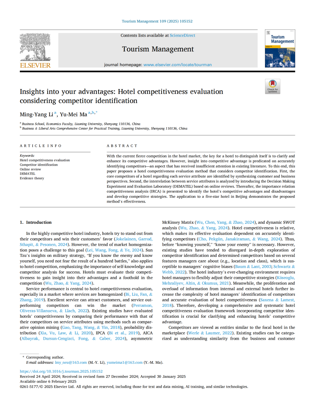 近日,威廉官网中国官方网站李铭洋教授与马玉梅博士的合作论文Insights into your advantages:Hotel competitiveness evaluation considering competitor identification在旅游管理领域国际顶级期刊Tourism Management在线发表。