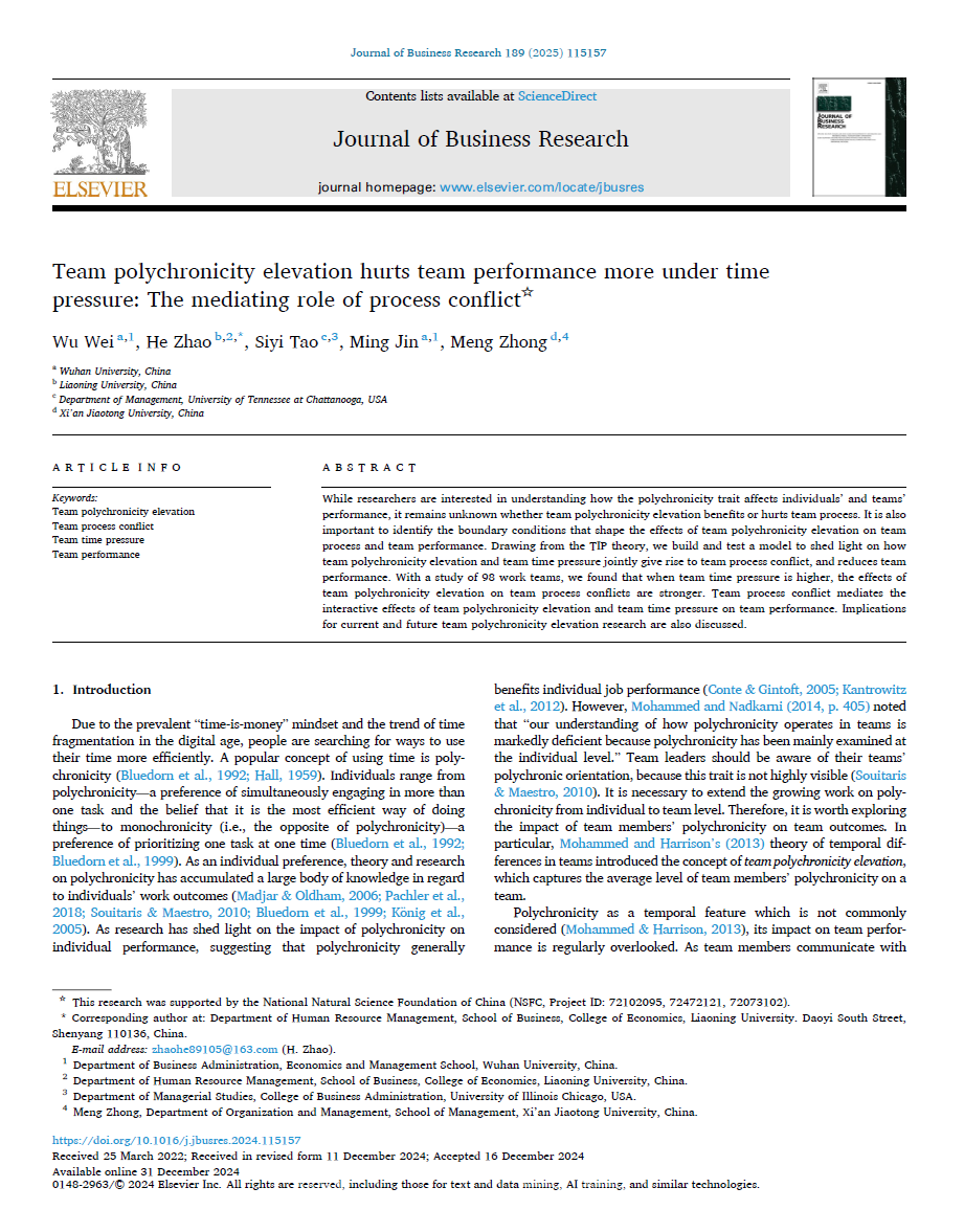 近日,威廉官网中国官方网站赵鹤讲师与武汉大学卫武教授等学者合作论文Team polychronicity elevation hurts team performance more under time pressure: The mediating role of process conflict在管理学权威期刊Journal of Business Research在线发表。