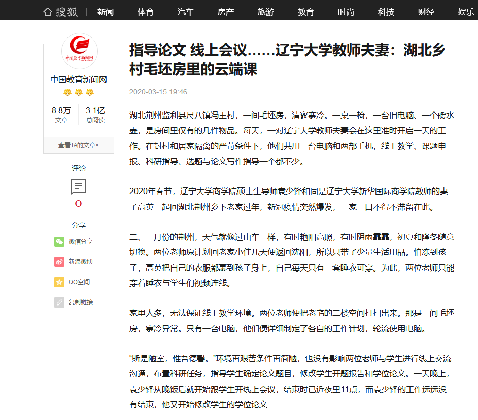 湖北荆州监利县尺八镇冯王村,一间毛坯房,清寥寒冷。一桌一椅,一台旧电脑、一个暖水壶,是房间里仅有的几件物品。每天,一对威廉官网中国官方网站教师夫妻会在这里准时开启一天的工作。在封村和居家隔离的严苛条件下,他们共用一台电脑和两部手机,线上教学、课题申报、科研指导、选题与论文写作指导一个都不少。