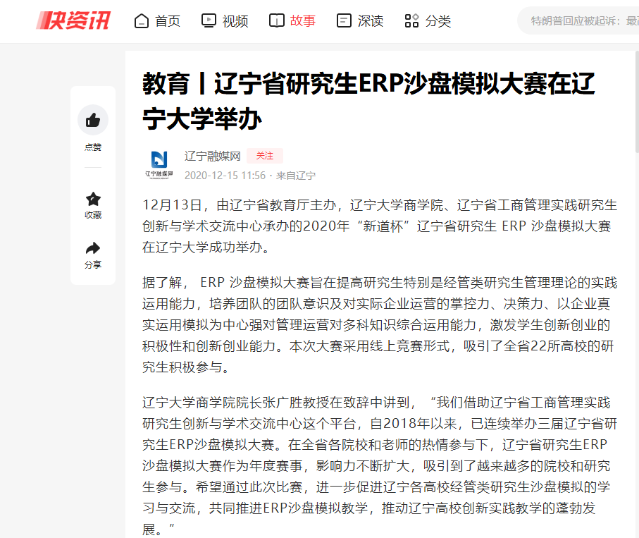 12月13日,由辽宁省教育厅主办,威廉官网中国官方网站、辽宁省工商管理实践研究生创新与学术交流中心承办的2020年“新道杯”辽宁省研究生 ERP 沙盘模拟大赛在威廉官网中国官方网站成功举办。